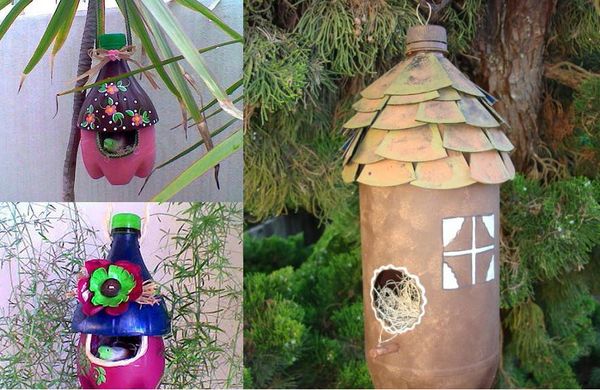 Vous devez d'abord faire un crochet pour le nichoir à l'aide de fil de fer. Ensuite, coupez les bouchons des deux bouteilles et préparez la base pour le toit. Après sa mise en place, de petits trous apparaîtront, qu'il faudra masquer avec une troisième bouteille.