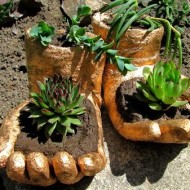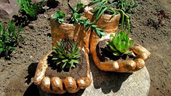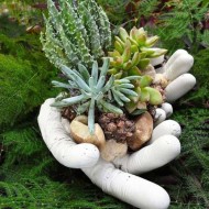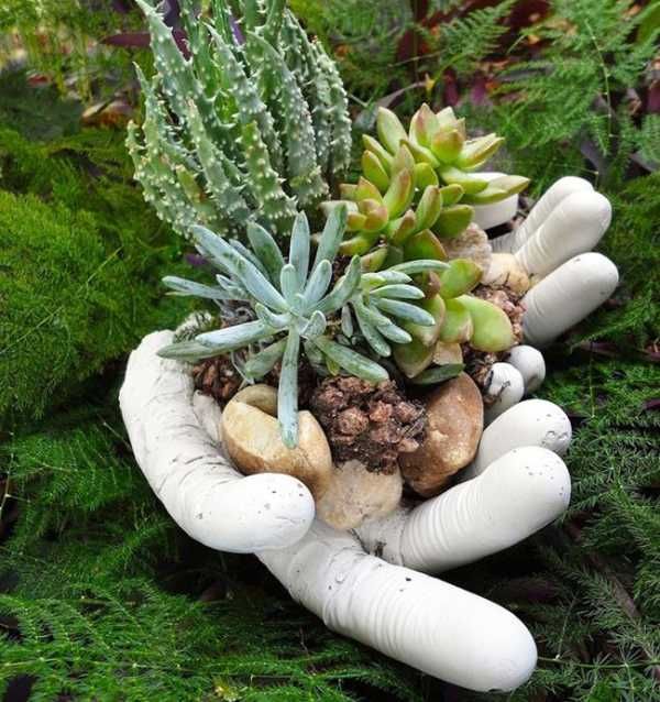 Les vrais jardiniers adorent créer des parterres de fleurs aux formes les plus bizarres. Une paire de mains faites de gants en caoutchouc semble originale, tenant des plantes vertes dans les paumes.