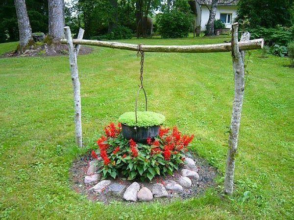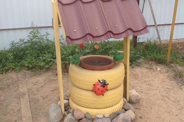- Le bol du puits est construit à partir de 2-3 vieux pneus, installés les uns sur les autres, et tout en haut, vous pouvez casser un parterre de fleurs.