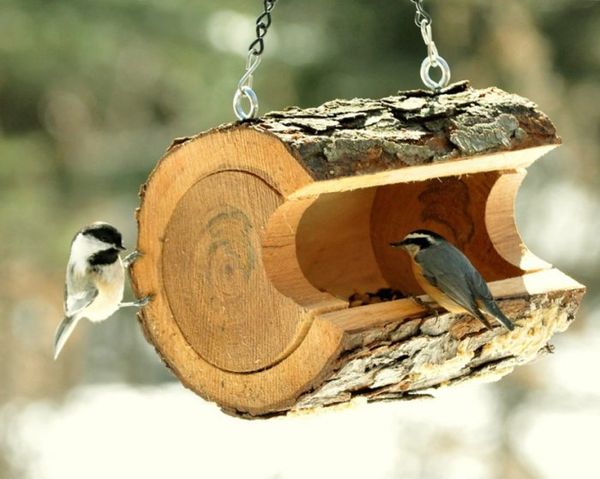 Bien que les magasins regorgent de toutes sortes de mangeoires pour oiseaux, dans le pays, les produits faits maison fabriqués à partir des mêmes bouteilles en plastique ou blocs de bois sont beaucoup plus jolis. Vous trouverez ci-dessous un exemple de mangeoire pouvant être construite à partir d'un petit morceau de bûche coupée :