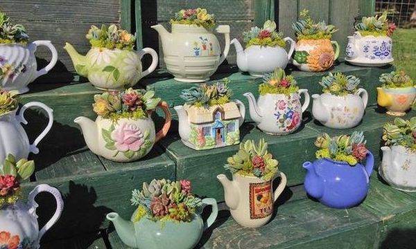 Une solution intéressante consiste à utiliser de la vieille vaisselle, qui s'accumule beaucoup dans n'importe quel ménage. Des tasses entières ou qui fuient, des théières, des pots, des pots en fonte feront l'affaire. Ces pots ont fière allure sur la table à manger, entourés de "vrais" plats, ils peuvent être placés sur la balustrade du gazebo ou accrochés à des fils dans les ouvertures des fenêtres.