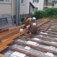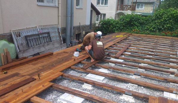- Hygroscopicité, à la suite de laquelle les produits sont sujets au gonflement et au gauchissement. Avec le traitement rapide des terrasses avec des composés protecteurs, sa résistance à l'humidité augmentera de 1,5 fois. Si cela n'est pas possible, il est préférable de fabriquer des sols extérieurs à partir de matériaux bois-polymère.