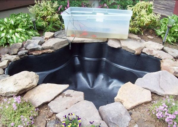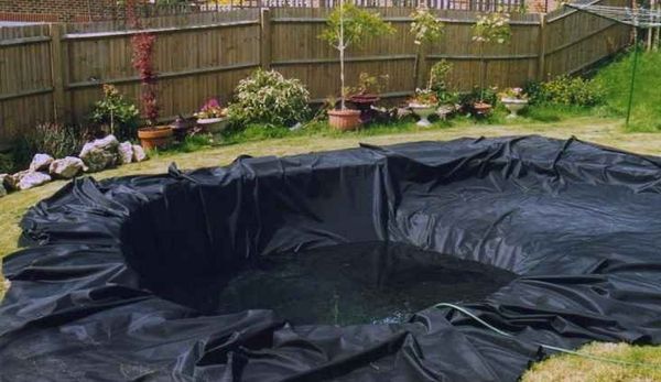 Le réservoir est rempli d'eau et laissé pendant une journée - cette période permettra au film de prendre sa forme définitive. Ensuite, ses bords sont posés dans le fossé préalablement creusé, l'excédent est coupé, le reste est rentré. Le fossé est recouvert de gravats.