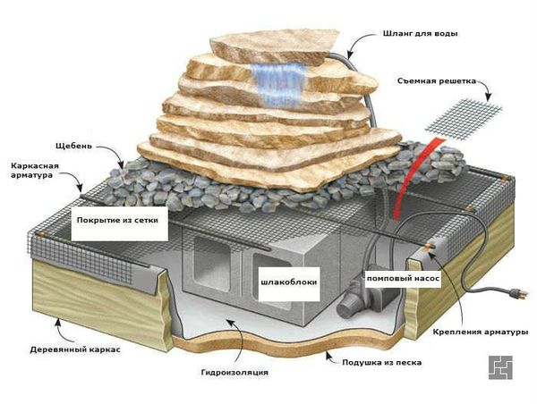 Si l'étang a une surface inégale, il est recommandé d'expérimenter avec des fontaines et des cascades lors de sa décoration. Pour cela, une zone spéciale de pierres est construite à l'avance. Pour construire une fontaine, vous aurez besoin de :
