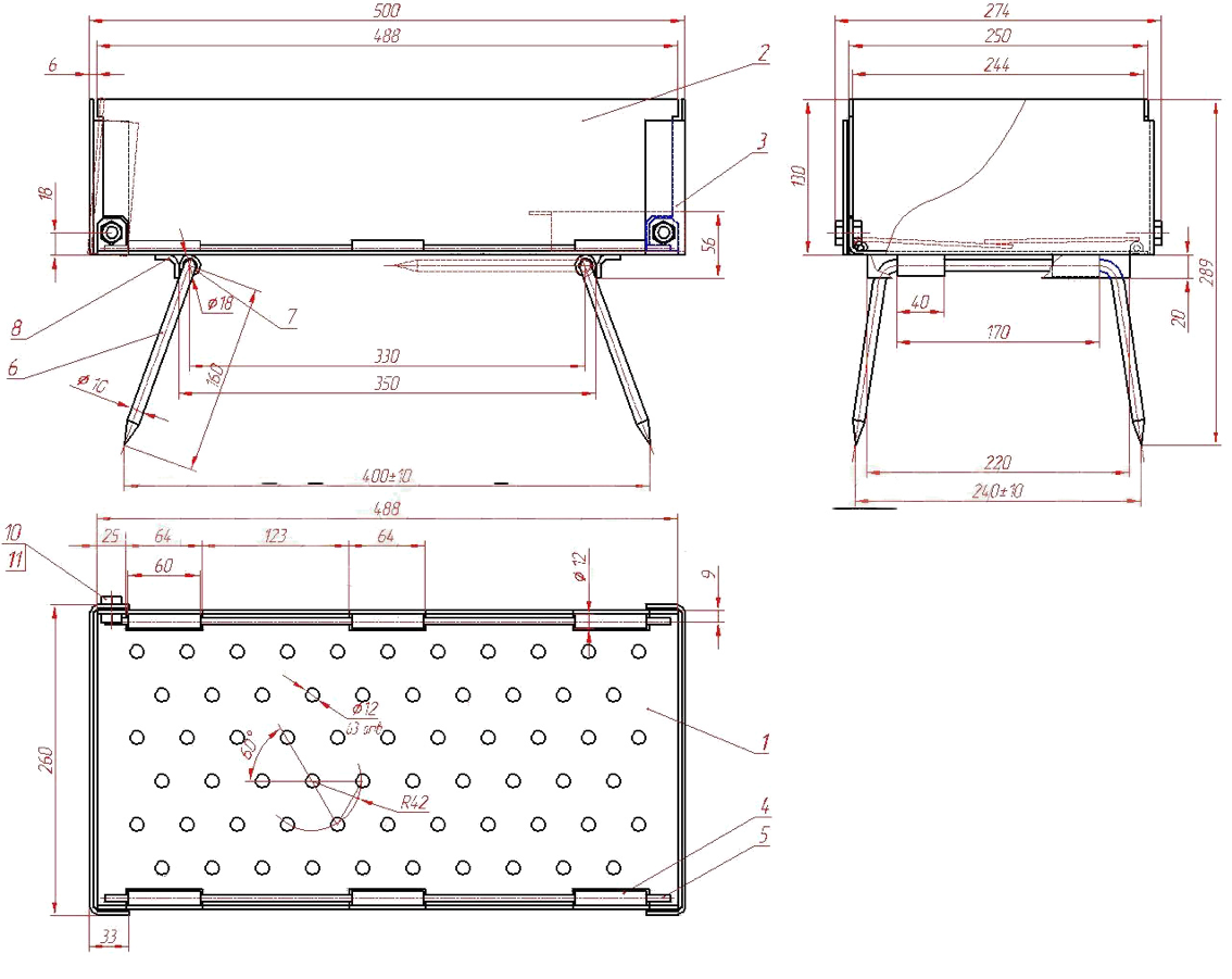 Au stade initial, vous devez créer un dessin et déterminer les dimensions du produit. En moyenne, le gril doit contenir de 6 à 10 brochettes de viande. Mais vous n'avez pas besoin de prolonger le brasier trop longtemps, car la structure s'avérera alors encombrante et il sera difficile de la transférer.