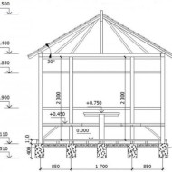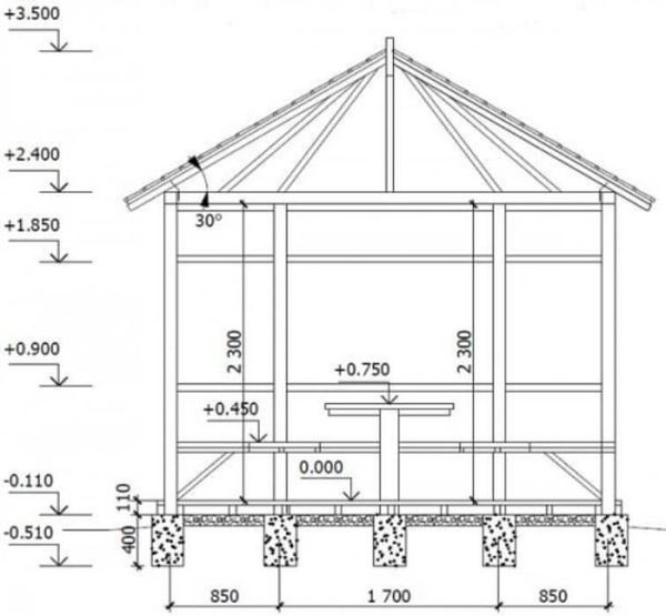 La hauteur du plafond du gazebo doit être comprise entre 2,5 et 3 m. Cette taille vous permettra de vous sentir à l'aise à l'intérieur du bâtiment et d'aborder raisonnablement l'utilisation des matériaux de construction lors de l'érection de supports en bois.
