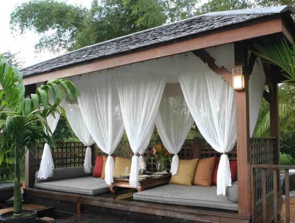 Vous pouvez décorer les kiosques de style Art Nouveau et Empire avec des produits en soie luxueux. Le matériau impressionne par sa brillance douce et ses teintes de couleur inhabituelles, mais en raison de sa sensibilité accrue aux températures extrêmes, il perd sa densité d'origine dès la deuxième année d'utilisation. Lorsque vous recherchez des tissus pour rideaux d'extérieur, n'oubliez pas les matériaux suivants :