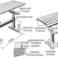 - Quatre pieds sont constitués de barres de 5x10 cm et d'une longueur de 95 cm. Il est souhaitable de les fixer en oblique, de sorte que les extrémités soient coupées à un angle de 30 °. Les deux jambes inclinées sont reliées par deux parois latérales transversales : l'une est au niveau supérieur avec les extrémités, l'autre est approximativement au milieu de leur longueur. La paroi latérale inférieure doit dépasser des deux côtés d'une quantité suffisante, les planches des bancs y seront fixées.