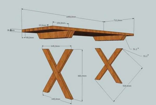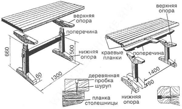 - Le plateau est assemblé séparément à partir de planches de 5x10 cm et 180 cm de long. Fixez-le aux pieds avec des vis autotaraudeuses.