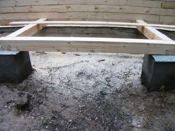 - Posez le matériau de toiture sur les fondations et posez des bûches dessus. Ils peuvent être fixés à la surface à l'aide d'un renfort en acier de la fondation.