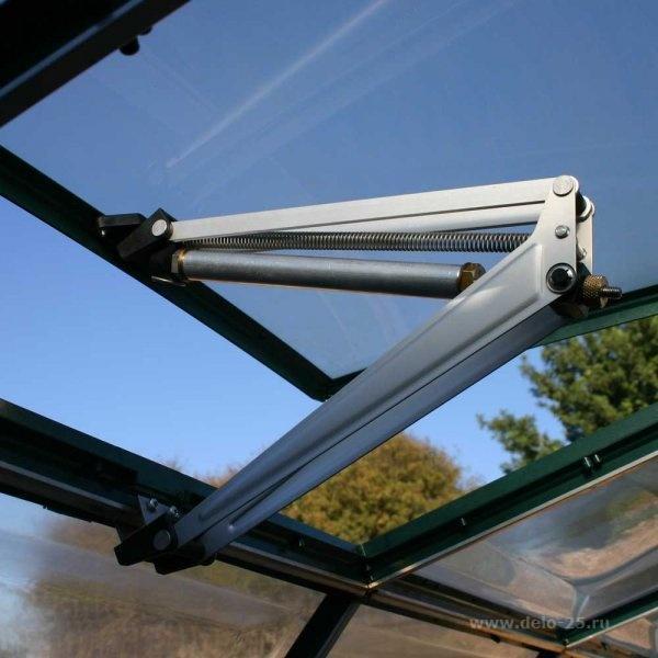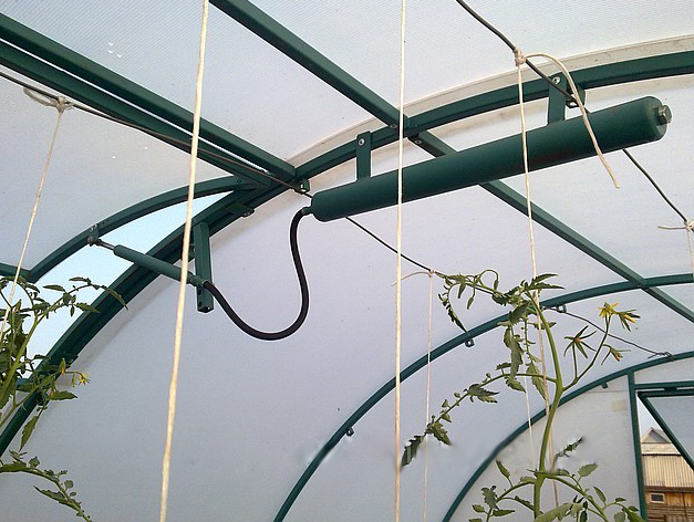 La base des éléments ouvrants des serres est un vérin hydraulique. Lorsque la température augmente dans la serre, l'huile dans le cylindre se réchauffe et se dilate, repoussant ainsi la tige. Il soulève le châssis lui-même et la fenêtre s'ouvre. L'air dans la serre est refroidi, au moment de l'aération, l'huile dans le cylindre se rétrécit à nouveau et à l'aide d'un ressort, le vantail claque. Le système coulissant est assez sensible, de sorte que la serre à ventilation automatique est protégée des rafales de vent et des pluies.