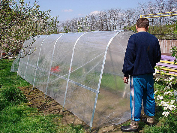 Si vous réparez tout bien, toute la structure peut être facilement transférée d'un endroit à l'autre, même à l'état assemblé: pour cela, il vous suffit d'obtenir les extrémités des arcs enfouis dans le sol. Après cela, il vous suffit de recouvrir l'ensemble de la structure avec un matériau de revêtement que vous choisissez vous-même, en fonction de vos demandes. Le film doit être bien fixé au châssis pour qu'il n'y ait pas de risque de vent fort, qui sera tout simplement emporté.
