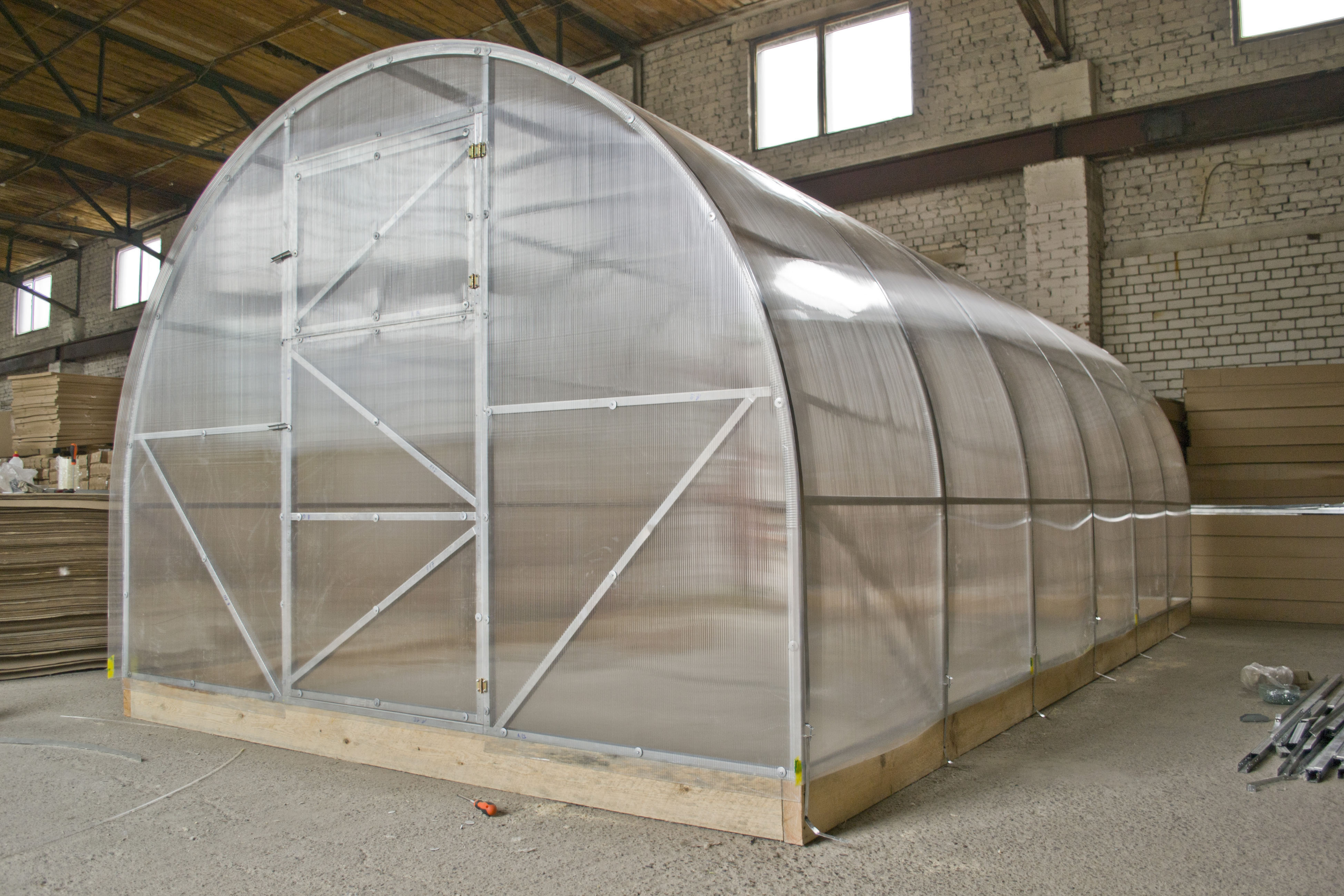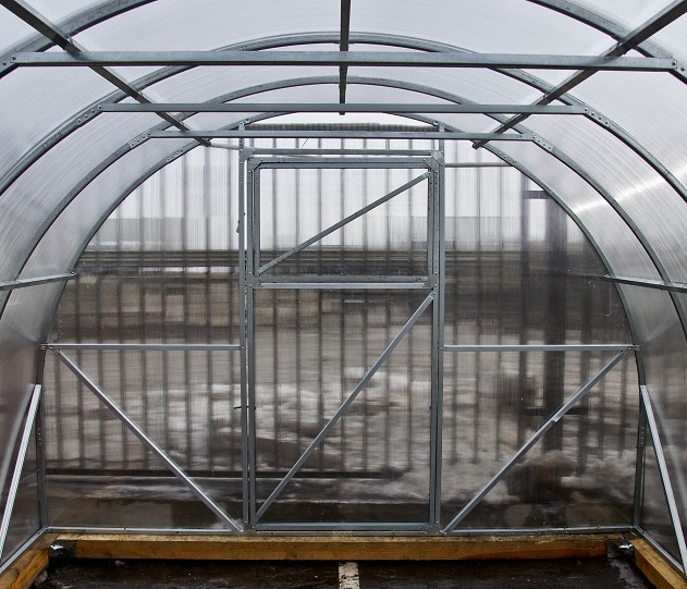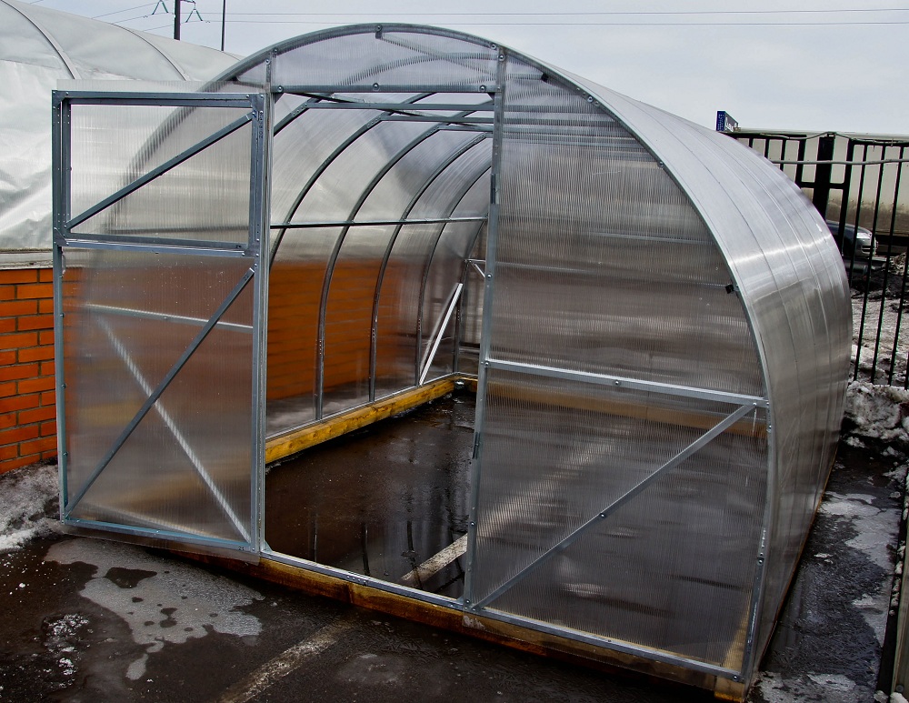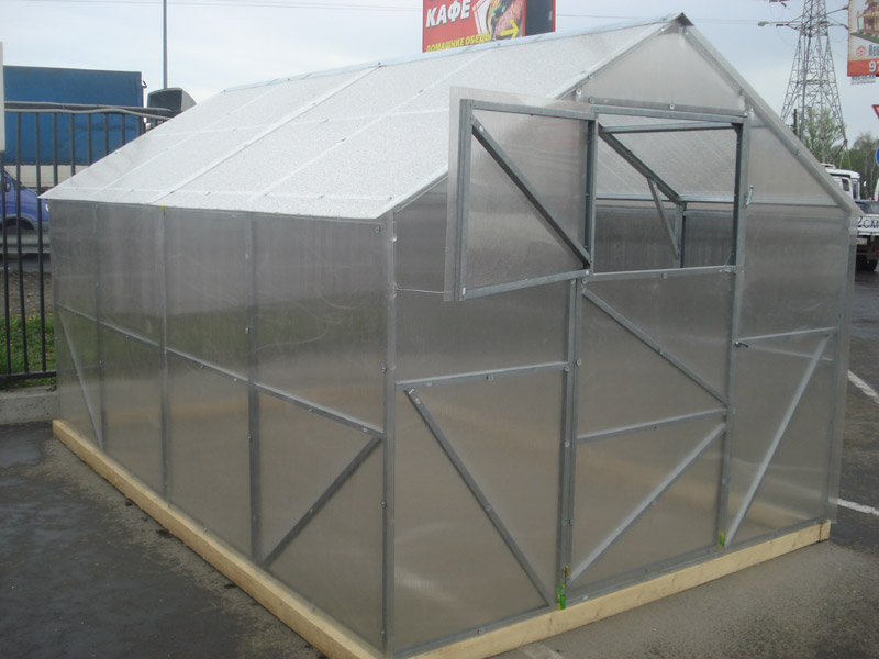 La serre de ce modèle est basée sur un profilé en acier galvanisé d'une épaisseur de 0,8 mm, chaque module est en outre renforcé pour une plus grande résistance structurelle. Il y a une porte - 90 cm de large. La taille standard est de 400 × 300 × 215 cm, ce qui implique des évents supplémentaires pour la ventilation de la pièce.