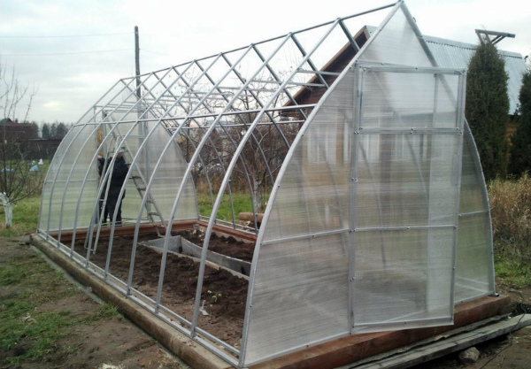 - Matériau de revêtement - polycarbonate, caractérisé par une résistance élevée. Même avec de fortes contraintes mécaniques sur la serre, ce revêtement ne forme pas d'éclats. Il convient également de noter que le matériau est protégé des effets des rayons ultraviolets - cela augmente considérablement la durée de vie. Après tout, tout le monde sait que sous l'influence du soleil, le polycarbonate commence à jaunir au bout de quelques mois, il ne transmet donc pas bien la lumière. Dans ce cas, une telle nuisance ne se produira pas.