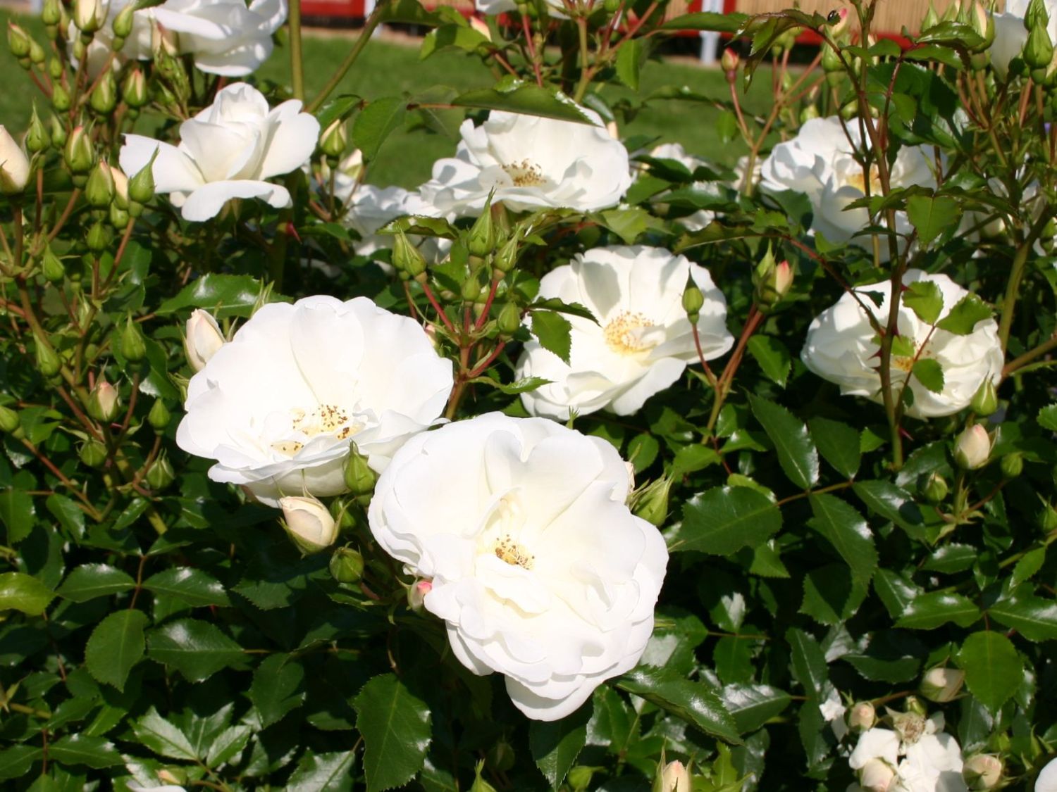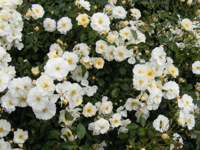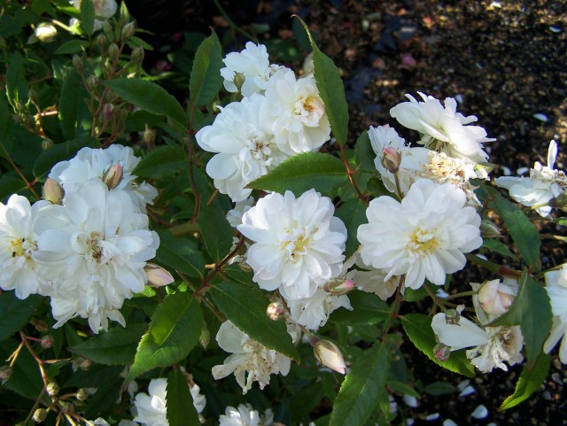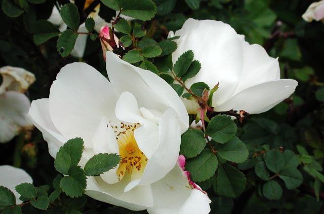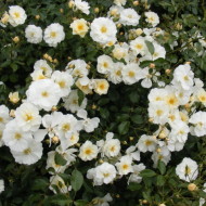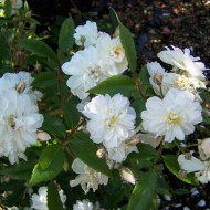 Un hybride à refloraison précoce a été élevé par des sélectionneurs nationaux en 1980. C'est un arbuste épineux étalé, de plus de deux mètres de haut. Les bourgeons d'un diamètre de 8 à 10 cm sont situés de manière très dense, se composent de pétales blancs comme neige et d'un centre jaune vif. La floraison dure du printemps à l'automne.