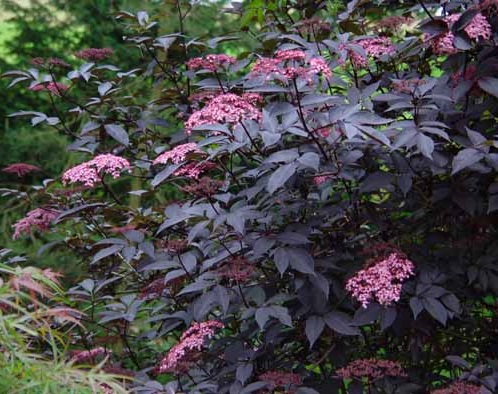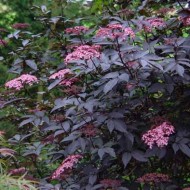 Arbuste d'ornement tentaculaire mesurant 3x3 m.Les tiges sont dressées, densément couvertes de feuilles étroites et allongées aux bords déchiquetés. Les pousses, ainsi que les plaques foliaires, sont peintes dans une couleur pourpre bordeaux foncé. Le sureau fleurit avec des inflorescences en forme de parapluie d'une teinte jaune crème ou rosâtre.