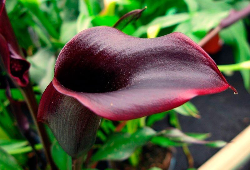 Elégants grands lys calla d'une teinte marron inhabituelle avec une teinte violette. La hauteur d'une plante adulte n'est que de 0,6 m.Les tiges sont dressées, du même ton sombre que les inflorescences. Les feuilles sont vertes, avec des taches claires et une fine bordure rouge foncé. Black Star fleurit de juin à août.