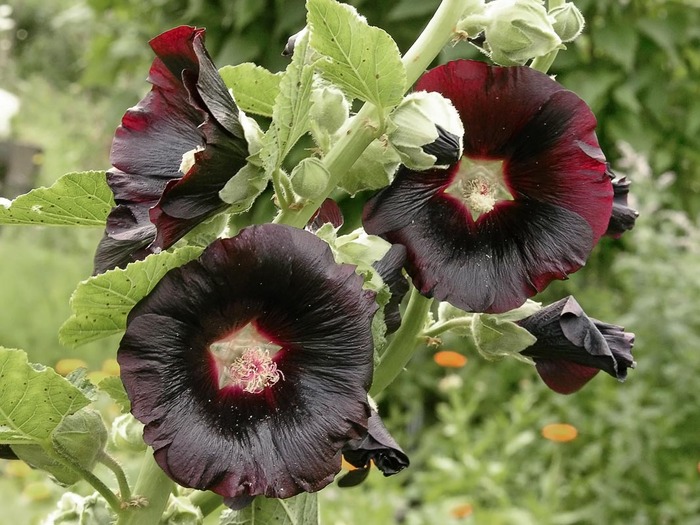 Les coquelicots noirs ont fière allure à côté des soucis jaune-orange.