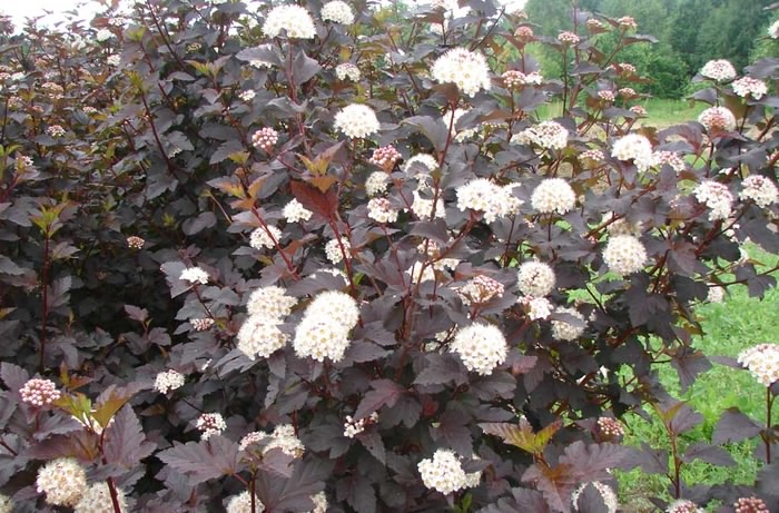 Arbuste tentaculaire aux branches pendantes mesurant 3x3 m.Les pousses sombres flexibles sont densément couvertes de feuilles trilobées ou à cinq lobes de couleur violet-bordeaux. Il fleurit au début de l'été, jetant des inflorescences de bougies blanc crème.