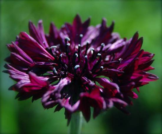 Un très bel hybride d'une hauteur de 0,6-0,8 m avec des tiges droites légèrement pubescentes. Les feuilles sont lancéolées, pointues. La variété se distingue par des inflorescences en forme de panier, de 30 à 40 mm de diamètre, rouge bordeaux, presque noires. Le bleuet se caractérise par une longue floraison - du début de l'été aux premières gelées.