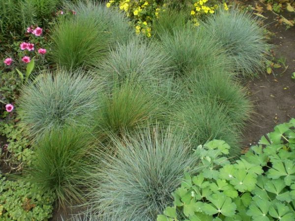 - fétuque grise (poussant jusqu'à 20 cm, résistante à la sécheresse, belle plante aux feuilles bleuâtres en forme d'aiguilles, fleurs - panicules rougeâtres douces; aimant la lumière, hiverne bien sans abri);