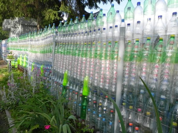 Si vous coupez les bouteilles dans le sens de la longueur en bandes de même largeur, vous pouvez en faire un osier décoratif. Vous aurez besoin de piquets verticaux, de préférence en bois, puis les bandes peuvent y être attachées avec du fil de fer ou des clous. Les clôtures à cadre de toute hauteur sont fabriquées à partir de bouteilles, il est clair qu'elles ont une fonction décorative, et certainement pas protectrice. Mais ils ressemblent à une vraie clôture.
