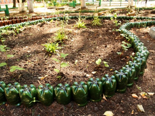 Si vous coupez le fond et insérez les bouteilles l'une dans l'autre, vous obtenez une sorte de serpent de n'importe quelle longueur qui peut être plié à n'importe quel angle, il est capable de se plier en douceur autour des formes arrondies des parterres de fleurs ou de décrire des parterres géométriquement réguliers . Seul ce serpent creux doit être rempli de quelque chose pour le rendre plus lourd et garder sa forme (n'importe quel matériau en vrac fera l'affaire). Il devra être légèrement creusé, au moins au tiers de la largeur, pour que la clôture soit stable.