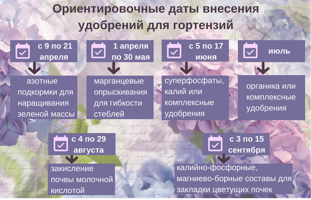 L'arrosage se fait au fur et à mesure que le sol s'assèche. Une fois par mois, pour la force des pousses, il est recommandé d'arroser l'hortensia avec une solution faible de permanganate de potassium. Les buissons sont très réactifs à l'alimentation, plusieurs d'entre eux sont réalisés par saison :