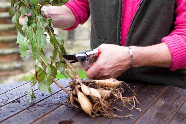 - Les racines sont soigneusement examinées pour la pourriture et les dommages. Les racines malades sont séparées et jetées. Les racines très longues sont légèrement raccourcies. Cette procédure rendra les tubercules compacts, ce qui les rendra plus faciles à stocker.