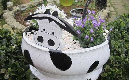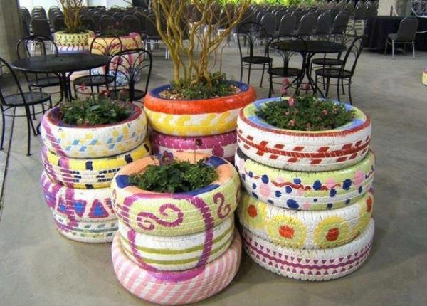 Des pneus de petite taille peuvent être utilisés pour créer des parterres de fleurs suspendus sous forme de pots, qui seront spectaculaires à l'entrée, sur la terrasse, le balcon. Peints en blanc, ils peuvent devenir un élément de décoration élégant à la fois dans la maison et dans la cour.