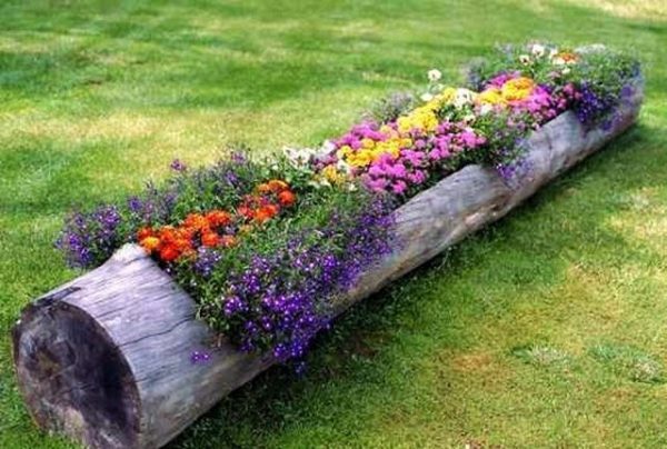 Une autre des façons les plus simples d'organiser une place pour les fleurs dans un chalet d'été consiste à utiliser des bûches solides. Cette option est particulièrement harmonieuse et élégante si la maison est en bois. Pour réaliser une telle conception de vos propres mains, vous devez choisir un matériau d'environ le même diamètre. Ensuite, ils découpent la longueur requise, retirent l'écorce des bûches et installent une clôture pour les fleurs. Les bûches prétraitées avec une composition antiseptique sont recouvertes d'un vernis foncé. Un tel jardin de fleurs fait maison s'intégrera à merveille dans le feuillage vert vif.