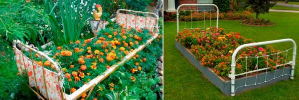 Une vieille plate-bande en métal peut devenir une plate-bande originale si les dos sont ennoblis par des plantes grimpantes, et des fleurs joyeuses prendront la place de ressorts. Ainsi, les vieux meubles peuvent décorer la cour et apparaître d'un tout autre côté. Seuls les meubles en bois doivent être traités avec une sorte d'antiseptique pour qu'ils durent plus longtemps sous l'influence du soleil et de l'humidité.