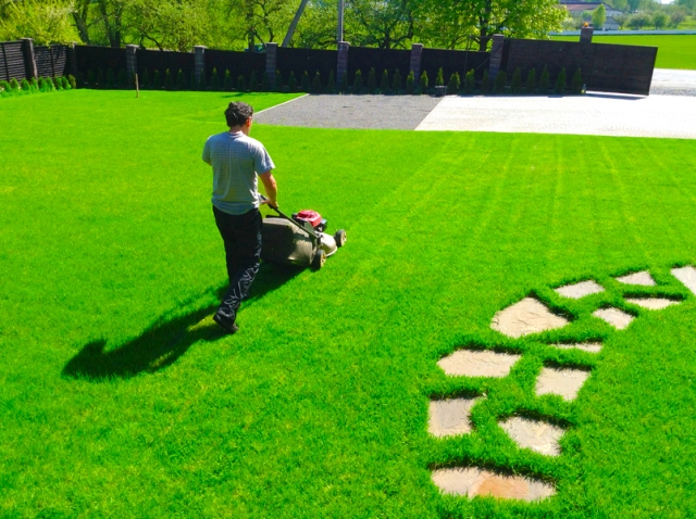 La première tonte est effectuée lorsque l'herbe s'étend sur 10-15 cm.Avant cela, vous ne devez pas marcher sur la pelouse, afin de ne pas blesser les jeunes pousses. Arrosez quotidiennement tout le site jusqu'aux premières pousses. Pour éviter que l'herbe ne jaunisse, à la chaleur, la pelouse est irriguée deux fois par semaine et uniquement le soir.