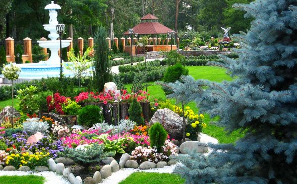 Un autre point qui doit généralement être réfléchi avant d'aménager un jardin de fleurs est le point de vue. S'il est visible d'un côté, alors les plantes sont disposées en termes de croissance de cette manière: à l'arrière-plan les plus hautes, et celles-ci peuvent être des roses anciennes, grimpantes ou standard, des buissons plus courts sont plantés devant elles, un couvre-sol et les miniatures sont placées au premier plan. Si le jardin de fleurs est regardé de tous les côtés, il s'avère très efficace de faire pousser en son centre une rose standard ou des roses frisées, reposant sur un support spécial.