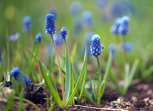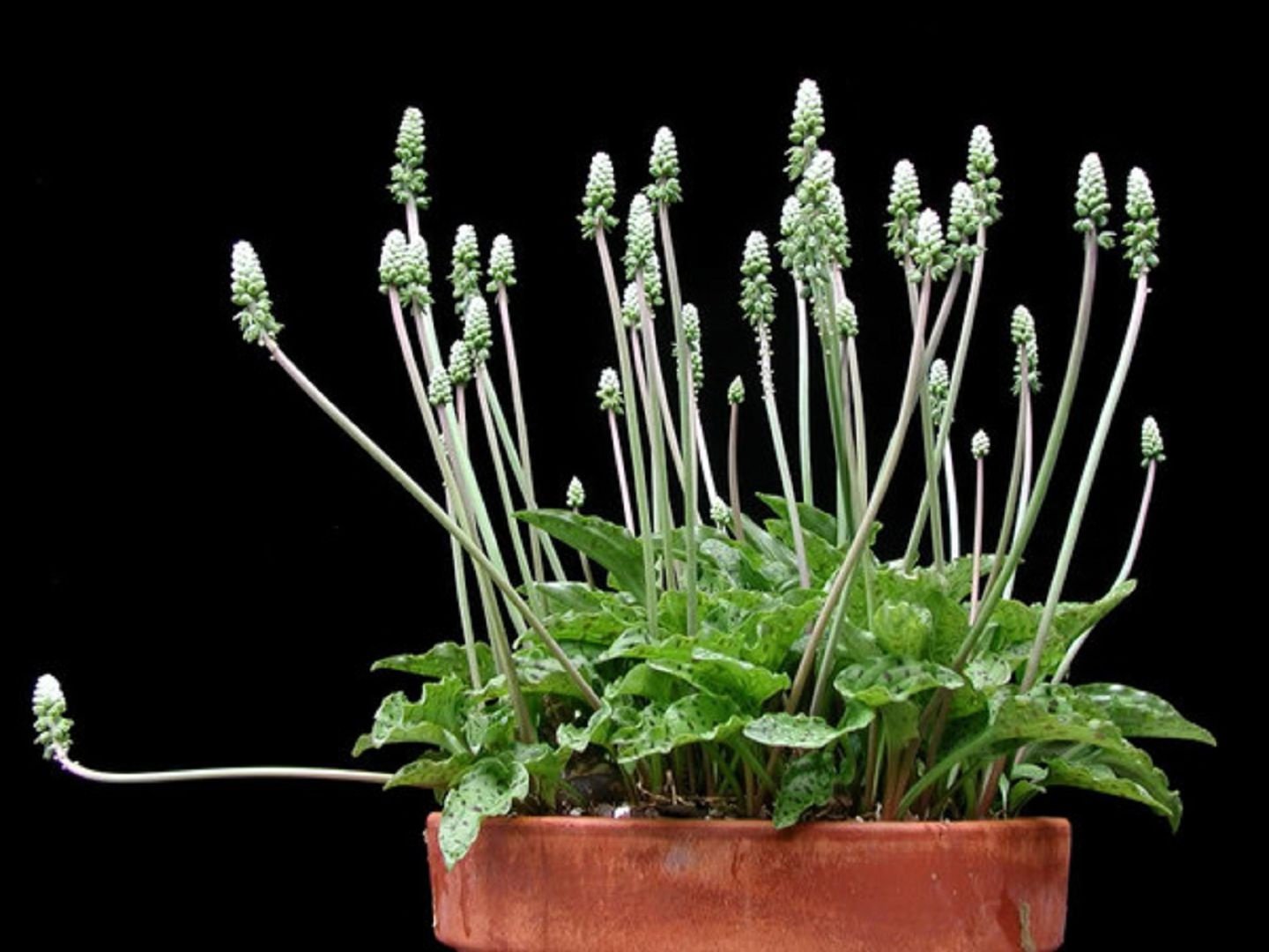 Ces bulbes sont également connus sous le nom de jacinthe de souris ou d'oignons vipères. Une plante basse (jusqu'à 10 cm) fleurit en avril et aime les endroits bien éclairés. Les inflorescences des muscaris ont une forme conique, elles sont blanches avec une teinte bleuâtre ou rose pâle.