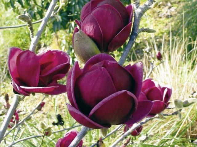 Magnolia compact, pas trop gros, jusqu'à 3 m de haut et environ un mètre et demi de diamètre. Les bourgeons s'ouvrent en premier, précédant l'apparition du feuillage. Les fleurs sont en forme de tulipe, peintes dans la couleur du vin de Bourgogne avec une teinte violette, ce qui donne aux pétales une texture veloutée.