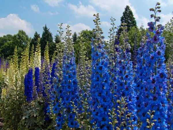 - le delphinium est une plante vivace très haute (jusqu'à 2 m) avec de longues inflorescences de couleur principalement violet-bleu, ne nécessite pas de soins ni de transplantation, se sent bien au soleil et à l'ombre, mais fleurit plus longtemps à l'ombre;