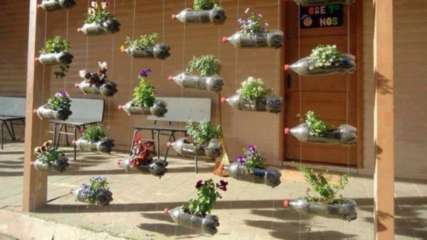- bouteilles en plastique et en verre (les récipients en plastique sont préférables, car ils sont faciles à couper, à peindre, à plier) - les bouteilles peuvent être utilisées comme bordures de parterres de fleurs, ainsi que comme récipient pour planter des plantes;