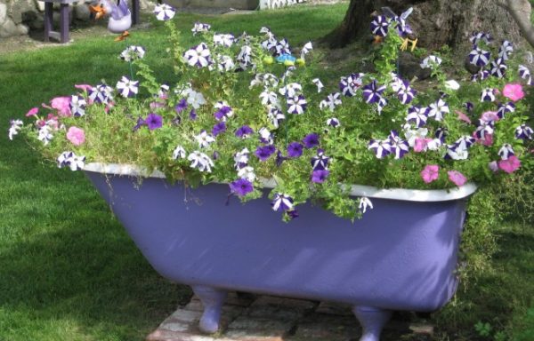 - plomberie: vieilles baignoires, toilettes, éviers, citernes - à partir de tels moyens improvisés, vous pouvez construire non seulement des parterres de fleurs colorés, mais également de petits réservoirs (des bains métalliques sont utilisés pour un réservoir);