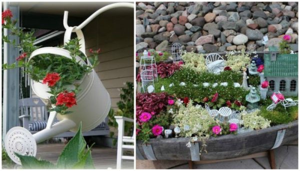 - un petit jardin fleuri peut être réalisé à partir de n'importe quel moyen disponible : canettes, tasses, pots, cruches, ustensiles de cuisine inutiles ;