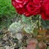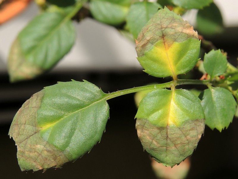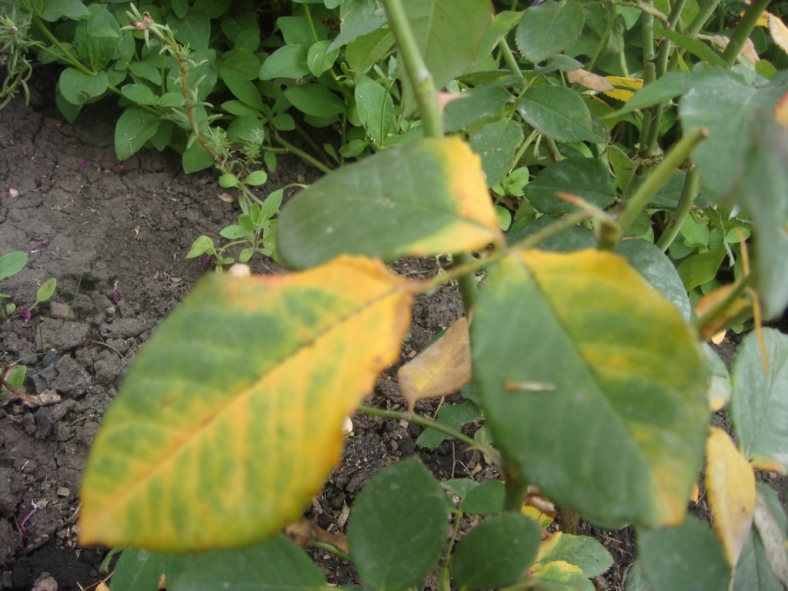- Les feuilles des roses au fond du buisson jaunissent, probablement à cause d'un manque de lumière. Peut-être que l'individu grandit à l'ombre et en souffre.