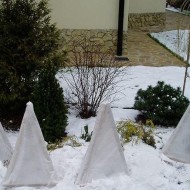 Les plantes à longues pousses sont fermées selon le même principe, seulement elles doivent être recouvertes par le haut d'un toit dur afin que la neige lourde ne roule pas sur tout l'abri, le privant de ventilation. Après la taille à la hauteur souhaitée, les fils et les cordes sont soigneusement dénoués, avec lesquels les pousses ont été attachées au treillis, les feuilles sont coupées avec des ciseaux, qui sont accrochés au support pour plus de stabilité.