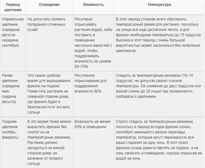 Les buissons de freesia poussent généralement jusqu'à 40 cm en juillet, puis des bourgeons se forment. La floraison a lieu en août, dure jusqu'en octobre.