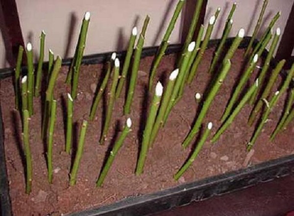 Dans le jardin dans un endroit calme et assez lumineux, ils creusent une tranchée de 20 centimètres de profondeur et d'environ 15. Une couche de sable de 5 cm d'épaisseur est versée sur le fond, humidifiée, des pommes de terre avec des brindilles sont posées dessus et tout cela est recouvert de Terre. Une serre est aménagée au sommet ou des boutures sont fermées avec des talus. De plus, de telles plantations inhabituelles sont arrosées et attendent l'apparition de nouvelles branches, ce qui montrera que les racines se sont déjà développées.