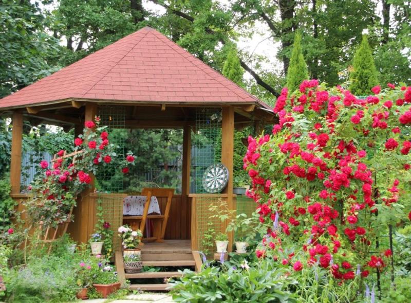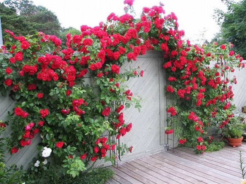 Un rosier grimpant est une décoration idéale pour un terrain personnel. Les flambants sont souvent utilisés pour décorer les murs des pavillons de jardin et des dépendances. La plante à floraison abondante semble intéressante sur les clôtures en fer forgé et les clôtures en bois. Décorés de gros bourgeons rouge cramoisi, les arches et les colonnes s'intégreront harmonieusement dans n'importe quel style de paysage.
