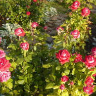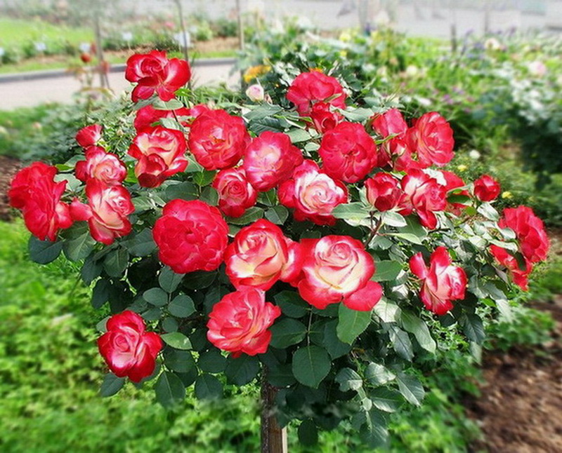 Lorsqu'elles sont plantées sur place, ces roses créent un accent lumineux et attirent l'attention sur une zone spécifique. Il est préférable de les planter à des endroits bien en vue - au premier plan des parterres de fleurs, près de la maison, le long des chemins, au centre des parterres de fleurs. Il convient de noter que les bourgeons bicolores sont spectaculaires en eux-mêmes, de sorte que les buissons peuvent être plantés séparément. Dans les plantations de groupe, la rose peut être complétée par des fleurs plus petites et de couleur plus claire.