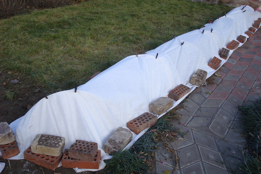 Les plantes jusqu'à 50 cm de hauteur ne peuvent pas être pliées. Un tuyau de matériau de toiture est installé autour d'eux, rempli de feuilles sèches. D'en bas, ils enduisent cette structure de terre et d'en haut, ils la recouvrent de lutrasil.