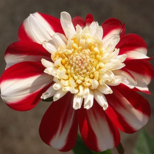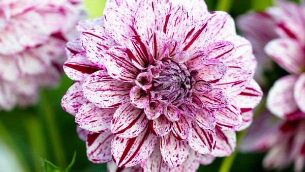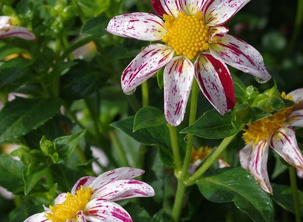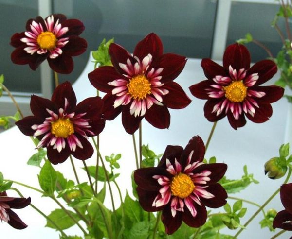 Il s'agit d'un dahlia court, dont les fleurs ont une couleur inhabituelle - blanche avec des rayures de couleur cerise.