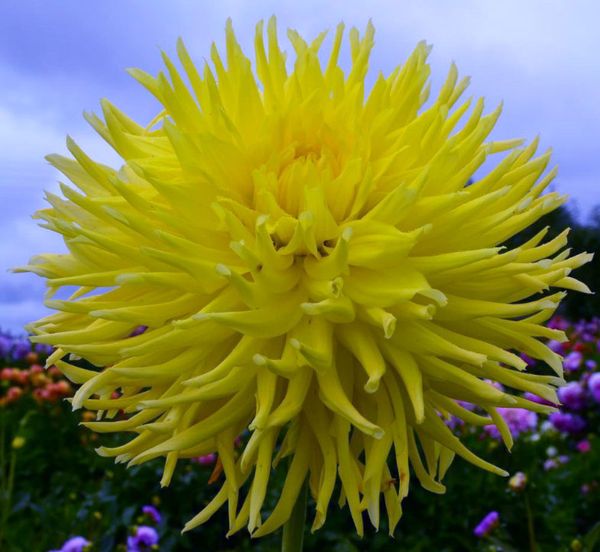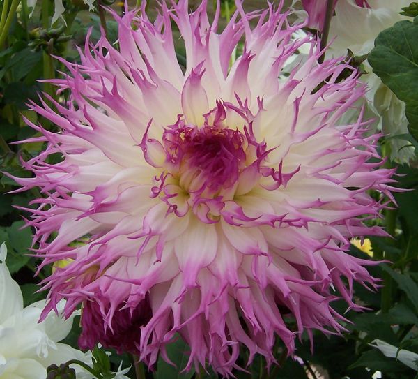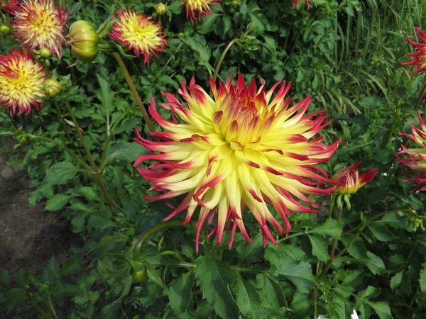 La hauteur de ces dahlias atteint 1,5 m, les fleurs sont grandes, les pétales sont enroulés vers l'intérieur. Pour cette raison, les fleurs marginales sont en forme d'aiguille.