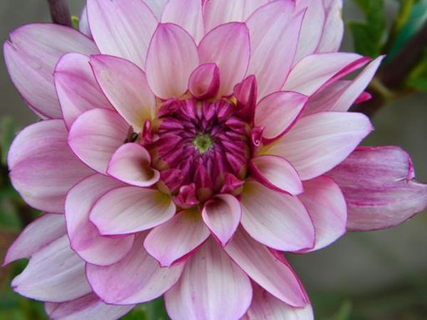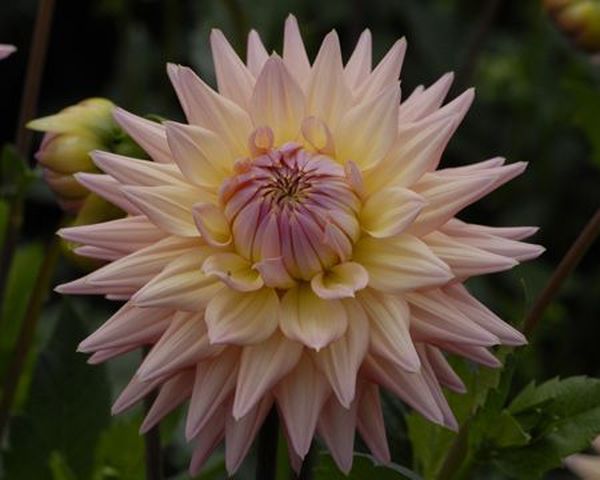 Les paniers de cette variété de dahlia sont grands. La rangée extérieure de pétales a un bord légèrement surélevé. Les inflorescences sont laiteuses avec des pointes rosâtres.